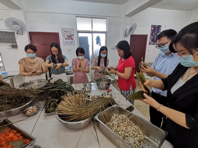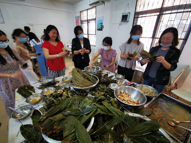 活動現(xiàn)場準(zhǔn)備了糯米、粽葉、板栗、蛋黃等材料,大家圍在一起,從嘗試、普及到大展身手,歡聲笑語、棕葉飄香,參與人員包得不亦樂乎。